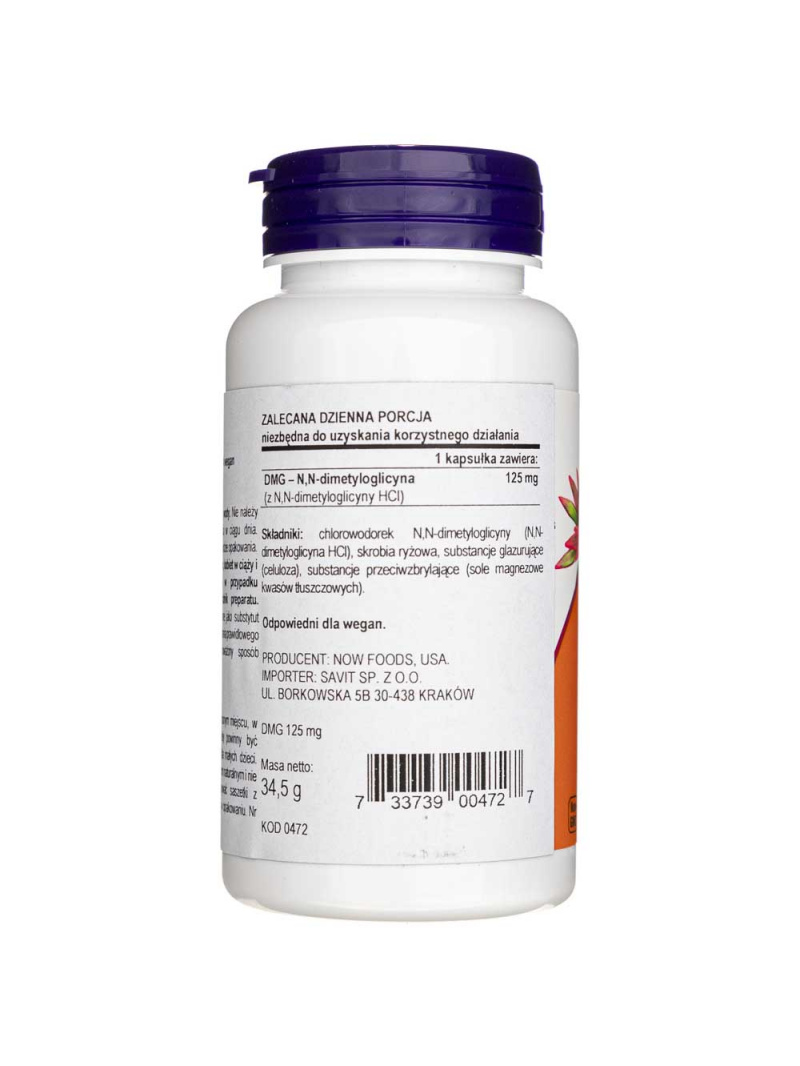 Zloženie produktu: N,N-dimetylglycín (DMG) (z N,N-dimetylglycín hydrochloridu), ryžová múka, želatína (kapsula) a stearát horečnatý (rastlinného pôvodu).