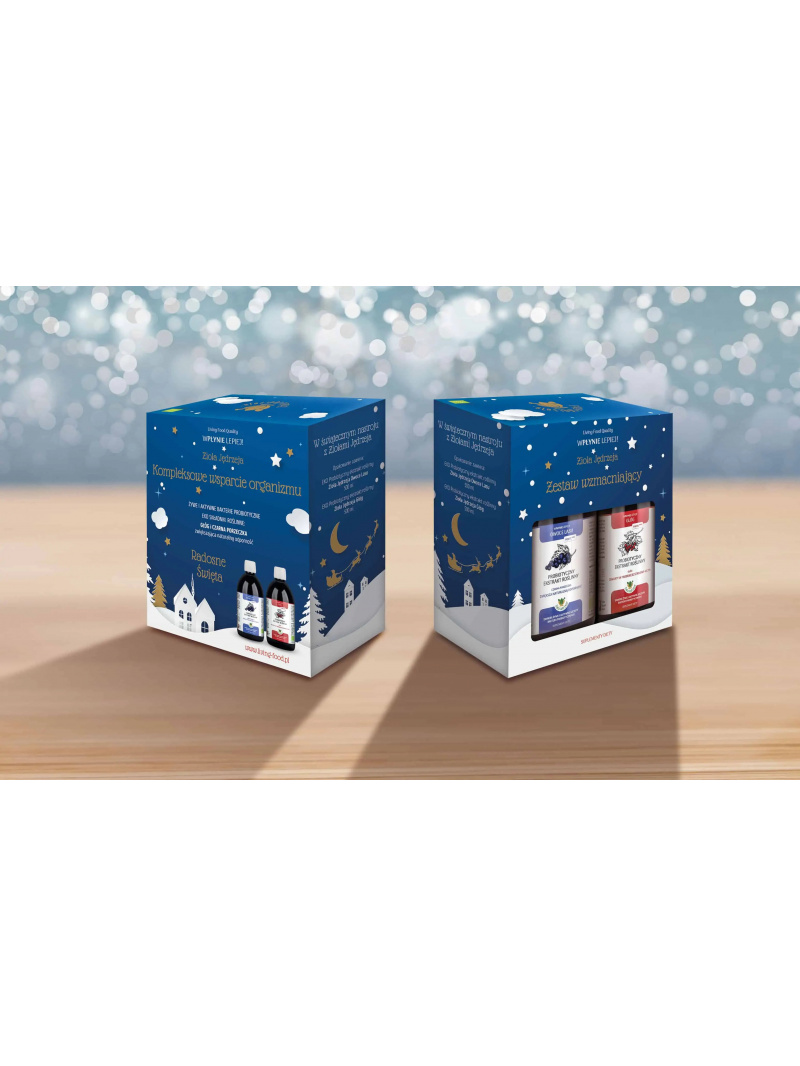 ECO Probiotický rastlinný extrakt Zioła Jędrzeja Lesné plody: Extrakt z fermentovaných bylinných rastlín a ovocia (100%) [vrátane: černicových listov (13,9%), čiernych ríbezlí (13,9%), cistusových bylín (13,9%), šípok (13,9%) , čierne ríbezle (13,9 %), černice (13,9 %), listy lesnej jahody (8,3 %), praslička roľná (8,3 %), sada živých a aktívnych kmeňov probiotických baktérií v tekutej forme (min. 2×10^7 cfu /ml)]. Doplnok sa vyrába v kaskádovom procese fermentácie rastlinných surovín so živými a aktívnymi kmeňmi probiotických baktérií vrátane: Lactobacillus rhamnosus GG, L. rhamnosus LR 04, L. rhamnosus LR 05, L. acidophilus LA 1, L. delbrueckii ssp. bulgaricus LB 2, L. casei 101/37, L. plantarum LP 02, L. plantarum LP 01, L. fermentum LF2, Bifidobacterium breve BL 10, B. breve Bbr 8, B. longum BL 03, B. animalis lactis Bi 1 , Streptococcus thermophilus Z 57, S. thermophilus 9 Y. EKO Probiotický rastlinný extrakt Jędrzeja Byliny Hloh: Extrakt z fermentovaných bylinných rastlín a plodov (100 %) [vrátane: plodov hlohu (23,3 %), kvetov hlohu (20 %), listy medovky (16,7 %), ľubovníka (16,7 %), lipových kvetov (13,3 %), prasličky roľnej (10 %), súbor živých a aktívnych kmeňov probiotických baktérií v tekutej forme (min. 2 x 107 cfu/ml)]. Doplnok sa vyrába v kaskádovom procese fermentácie rastlinných surovín so živými a aktívnymi kmeňmi probiotických baktérií vrátane: Lactobacillus rhamnosus GG, L. rhamnosus LR 04, L. rhamnosus LR 05, L. acidophilus LA 1, L. delbrueckii ssp. bulgaricus LB 2, L. casei 101/37, L. plantarum LP 02, L. plantarum LP 01, L. fermentum LF2, Bifidobacterium breve BL 10, B. breve Bbr 8, B. longum BL 03, B. animalis lactis Bi 1, Streptococcus thermophilus Z 57, S. thermophilus 9 Y.