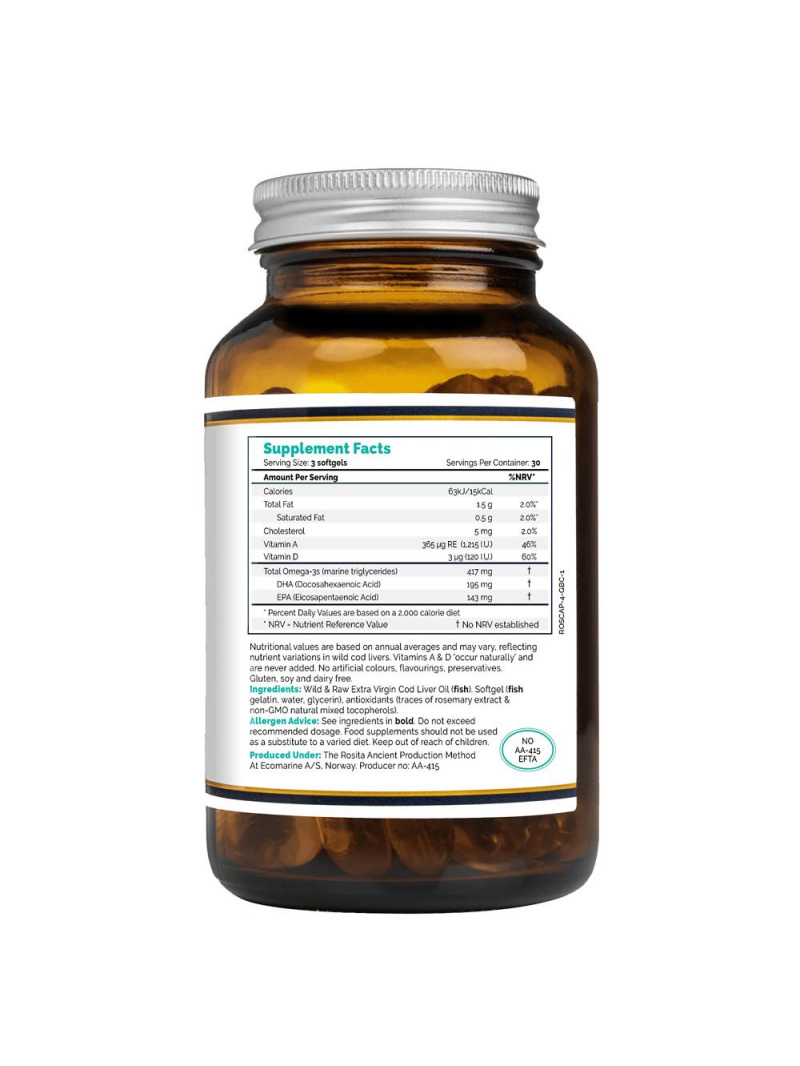 Zloženie produktu: Divoký a surový panenský olej z tresčej pečene, rozmarínový olej, organický vitamín E, kapsuly z rybieho kolagénu.